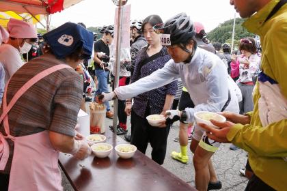 フィニッシュ地点・下山後のメイン会場にて、地元の食材を使用したおもてなし/メカニック/マッサージ