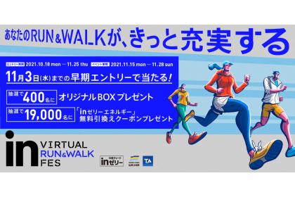 inゼリーがバーチャルランニングイベントを開催。ランニングアプリを活用し、2週間で目標距離走破にチャレンジしよう。参加費は無料!11月3日までにエントリーいただいた方の中から抽選で19,000名に「inゼリー エネルギー」コンビニ無料引き換えクーポンを、抽選で400名にオリジナルBOXをプレゼント