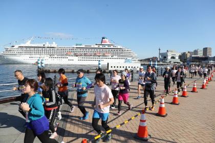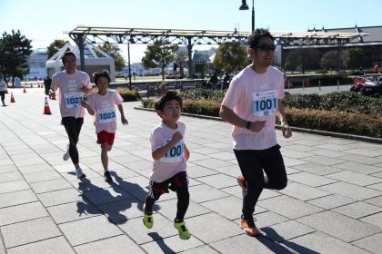 桜舞う春の横浜(横浜赤レンガ倉庫付近)を走るマラソン。個人ラン(5km、10km)、親子ラン(1.5km)、リレーラン(5km、10km)など心地よい浜風を感じながら、横浜での春ランを満喫してください。