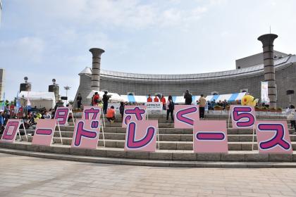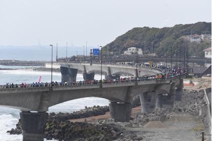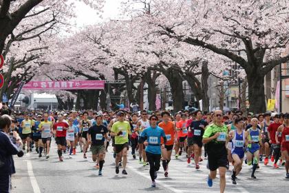 日立さくらまつりが開催中で、観光客の応援も多くにぎやかな大会。桜のアーチやシーサイドを走るコースもあります。