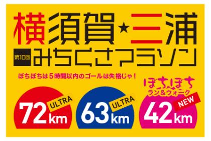 全国でも屈指の風光明媚な海岸線を持つ三浦半島の横須賀市・三浦市をまるごと走る、 神奈川県の唯一のウルトラマラソン大会とみちくさ恒例のぼちぼちマラソンの3種目。豊かな海の幸や畑の幸を存分に味わっていただき、 絶景を見ながらアップダウンの続く難コースを走り達成感をあじわっていただきます。