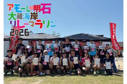 明石海峡大橋、淡路島を望む最高のロケーションでのリレーマラソンとなります。 気持良い春の潮騒が吹く大蔵海岸公園で仲間と楽しく走りませんか? 駅より徒歩2分の利便性の良さ。参加賞は明石焼きセット・たこ焼きソースと温泉割引券です♪大会MCもいて盛り上がる事間違いなしです~