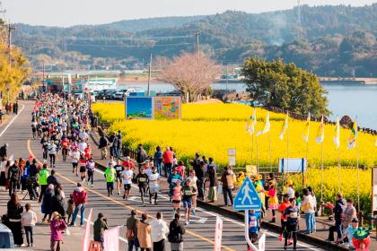 九州最大の湖「池田湖」や、薩摩富士と称される「開聞岳」などの観光名所を走る眺めのいいコース。コース上には、一足早い満開の菜の花が咲き乱れ、地元住民の特産品を使った多くの私設エイドが人気。制限時間も8時間とゆるく初心者でも参加しやすい。